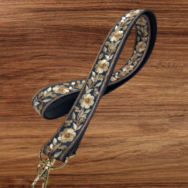 ストラップホルダー付き インド刺繍リボンショルダーストラップ 裏地合皮レザー サイドステッチデニムブルー