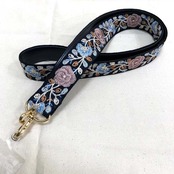 ストラップホルダー付き インド刺繍リボンショルダーストラップ 裏地合皮レザー ブラック/ライトパープルフラワ
