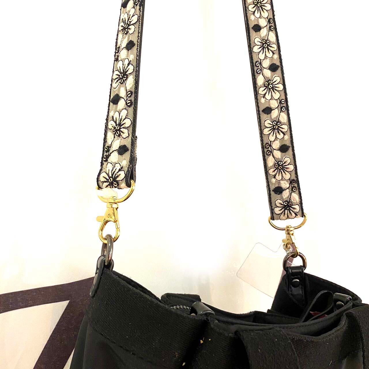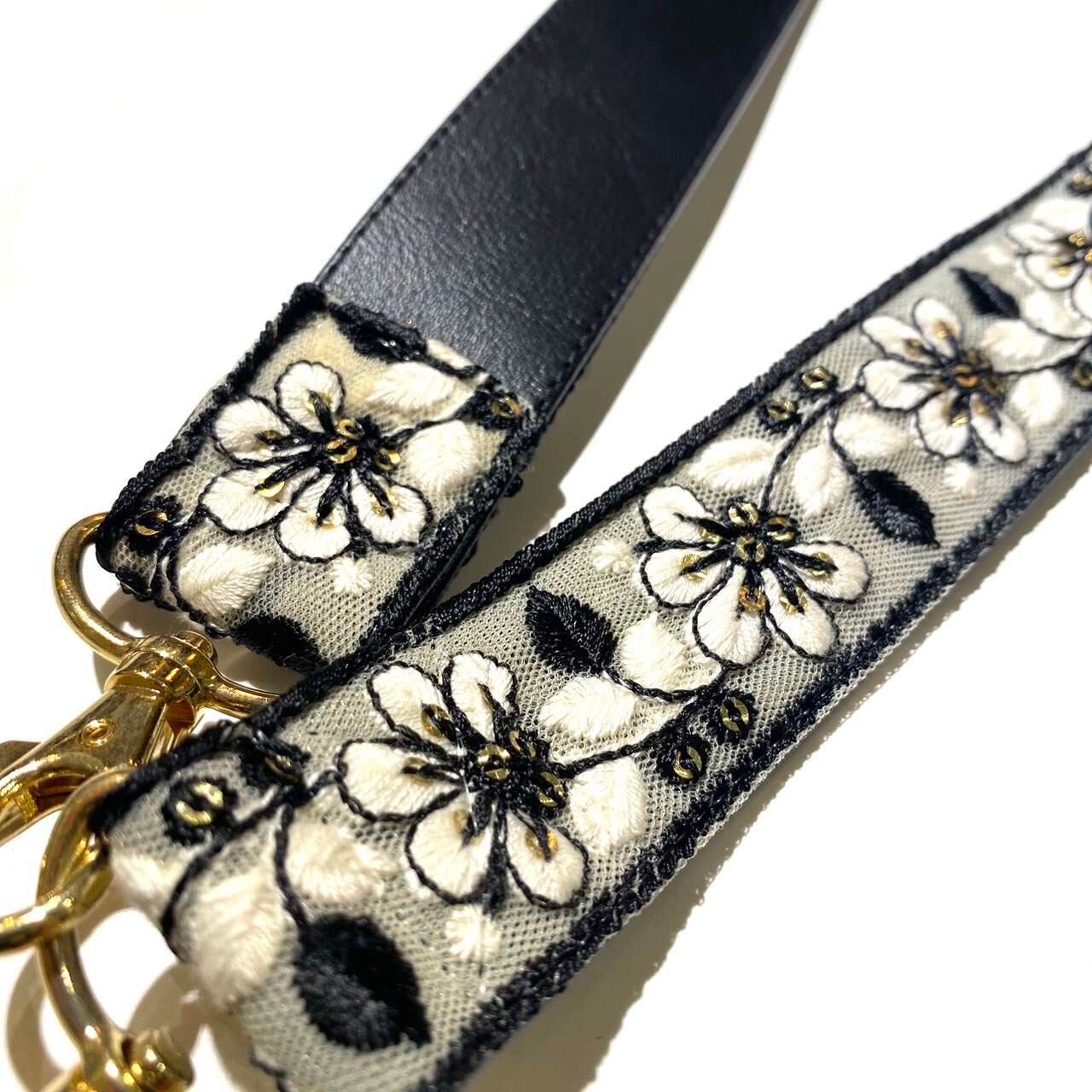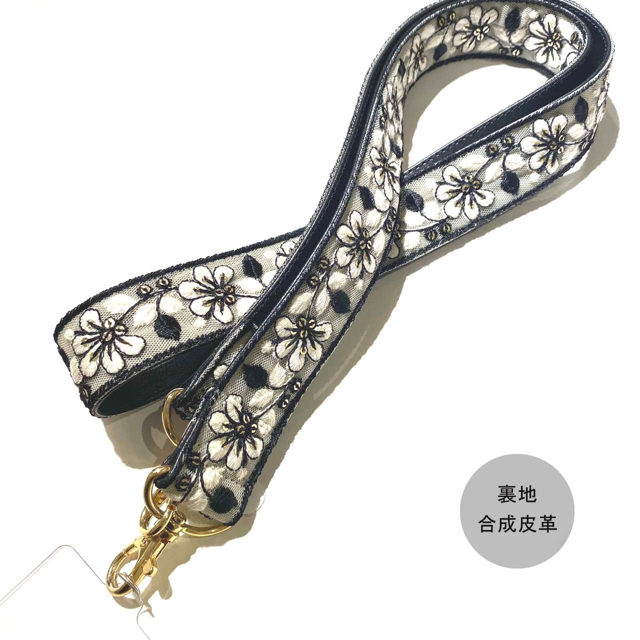 ストラップホルダー付き インド刺繍リボンショルダーストラップ 裏地合皮レザー チュール/グレー