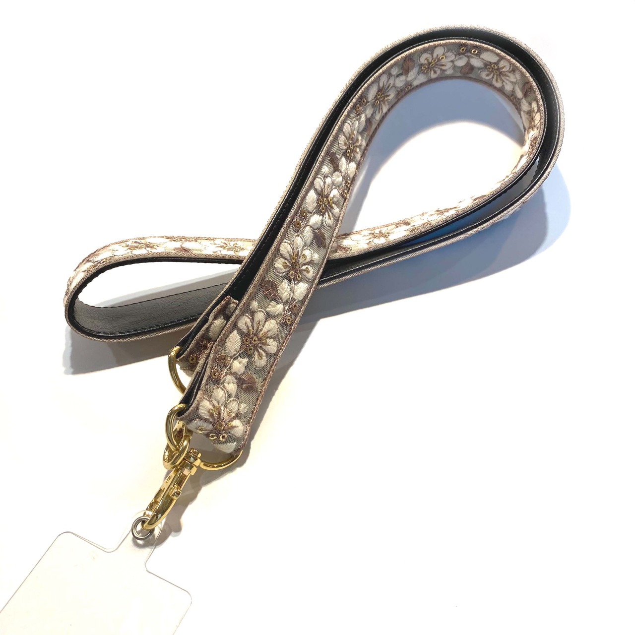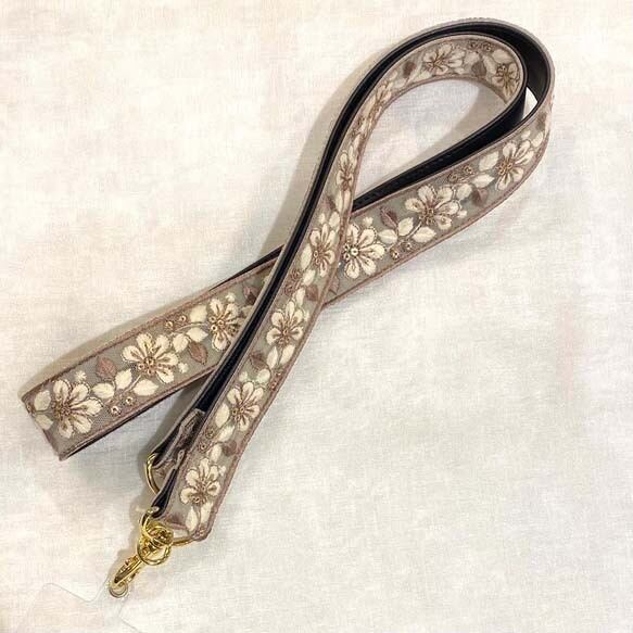 ストラップホルダー付き インド刺繍リボンショルダーストラップ 裏地合皮レザー チュール/モカ