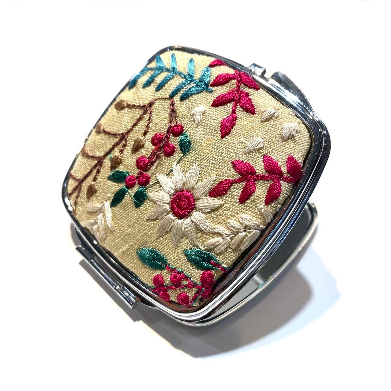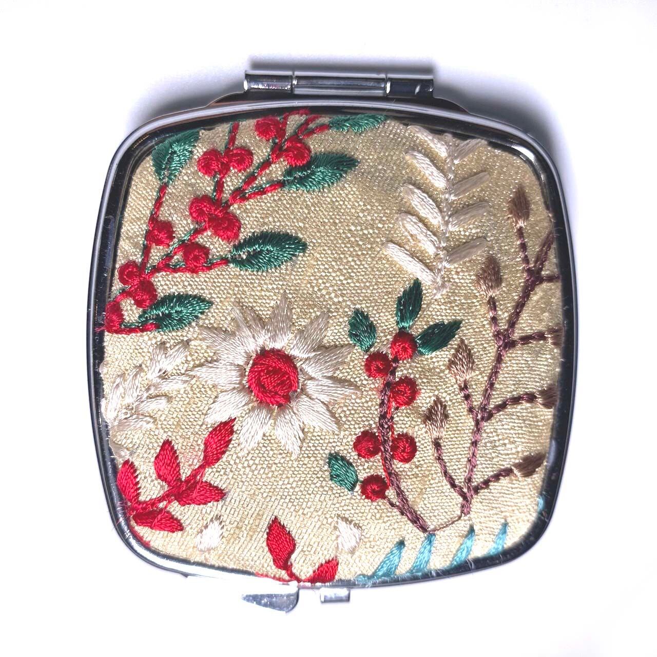 【コンパクトミラー ベージュ小花】インド刺繍リボン スクエアー型 四角 鏡 ミラー 拡大鏡