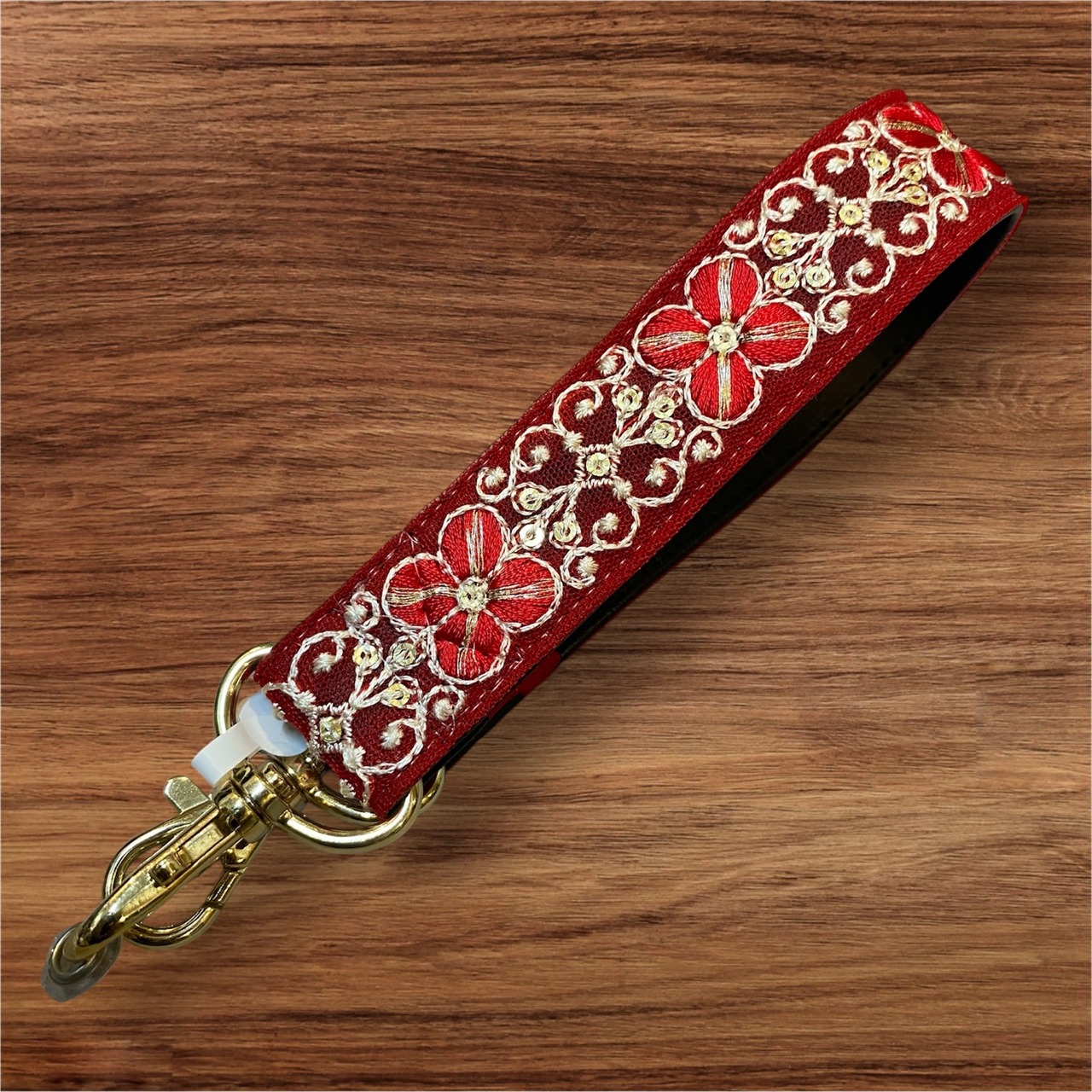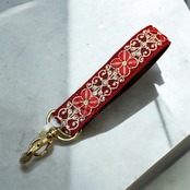 ストラップホルダー付き インド刺繍リボンハンドストラップ 裏地合皮レザー 花レッド