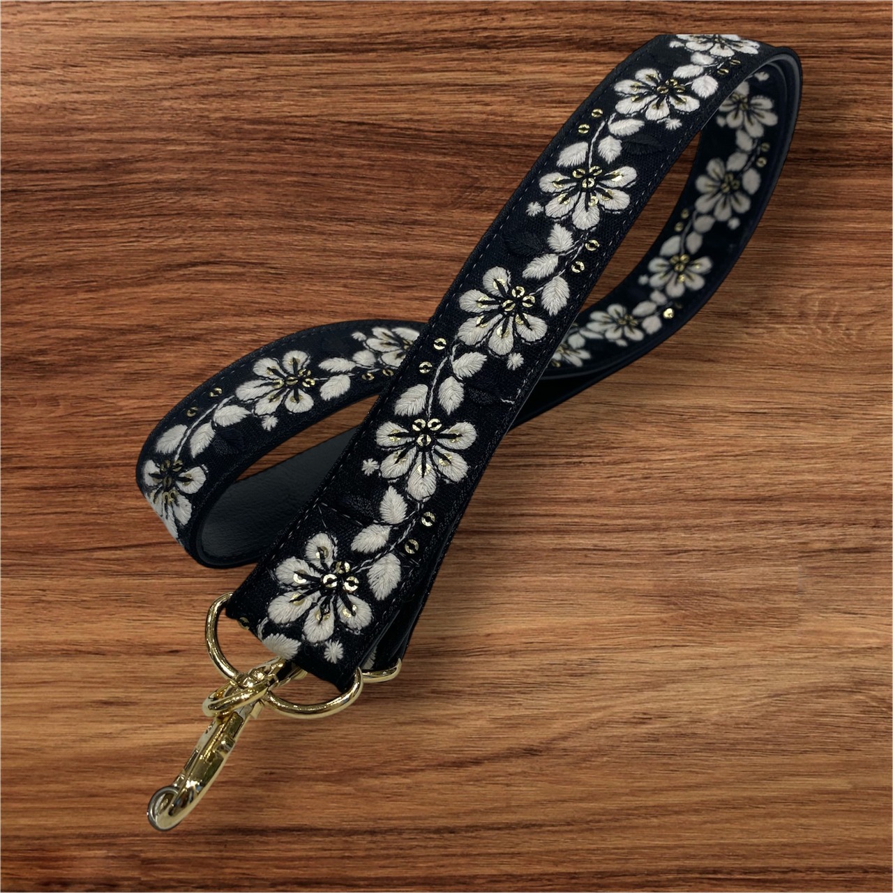 ストラップホルダー付き インド刺繍リボンショルダーストラップ 裏地合皮レザー チュールブラック