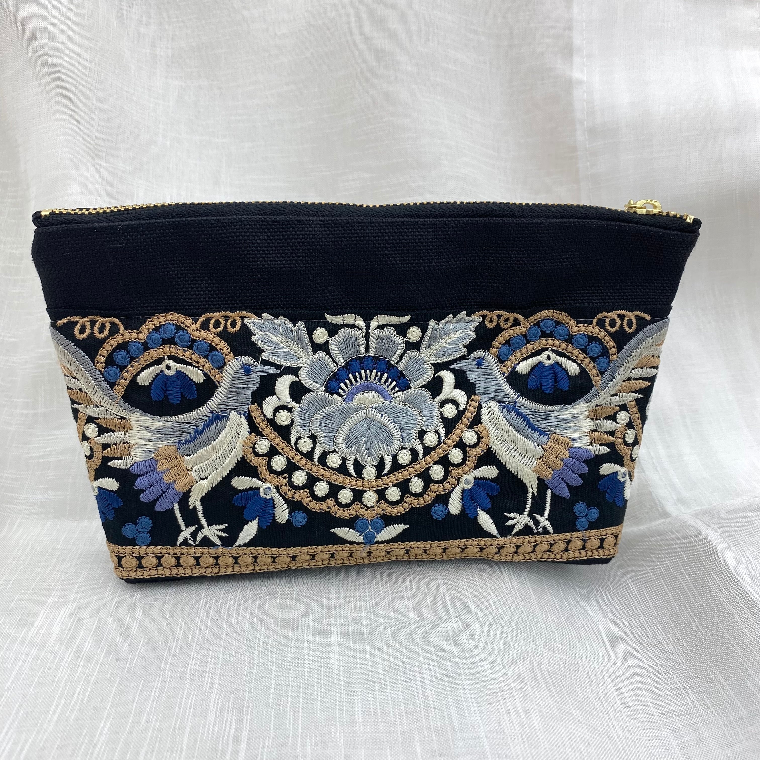 倉敷帆布の生地で作った丈夫なインド刺繍リボンポーチ 鳥柄11X20x5