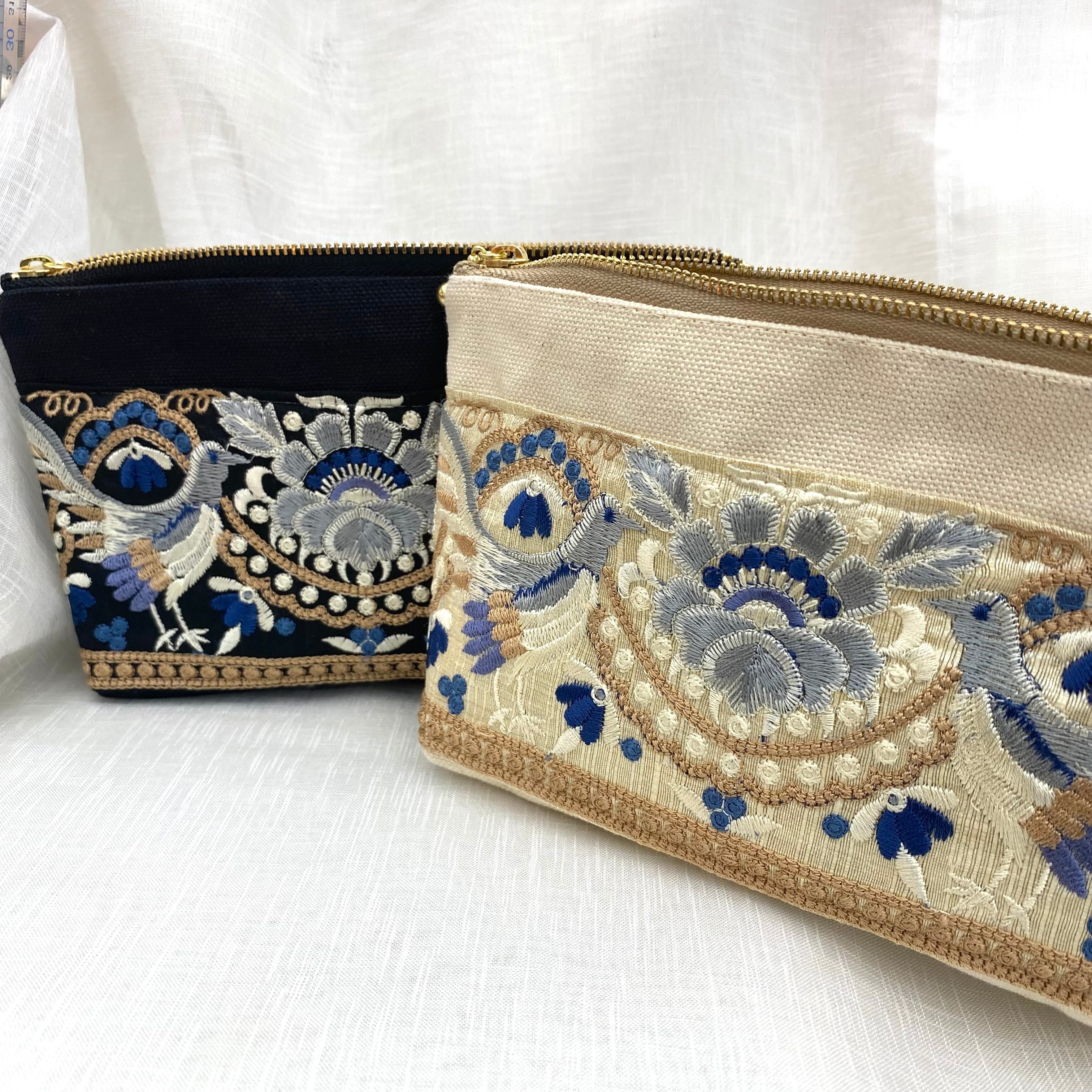 インド刺繍リボンの華やかさをポイントに倉敷帆布の丈夫な生地で使いやすい大きさのポーチに仕上げています