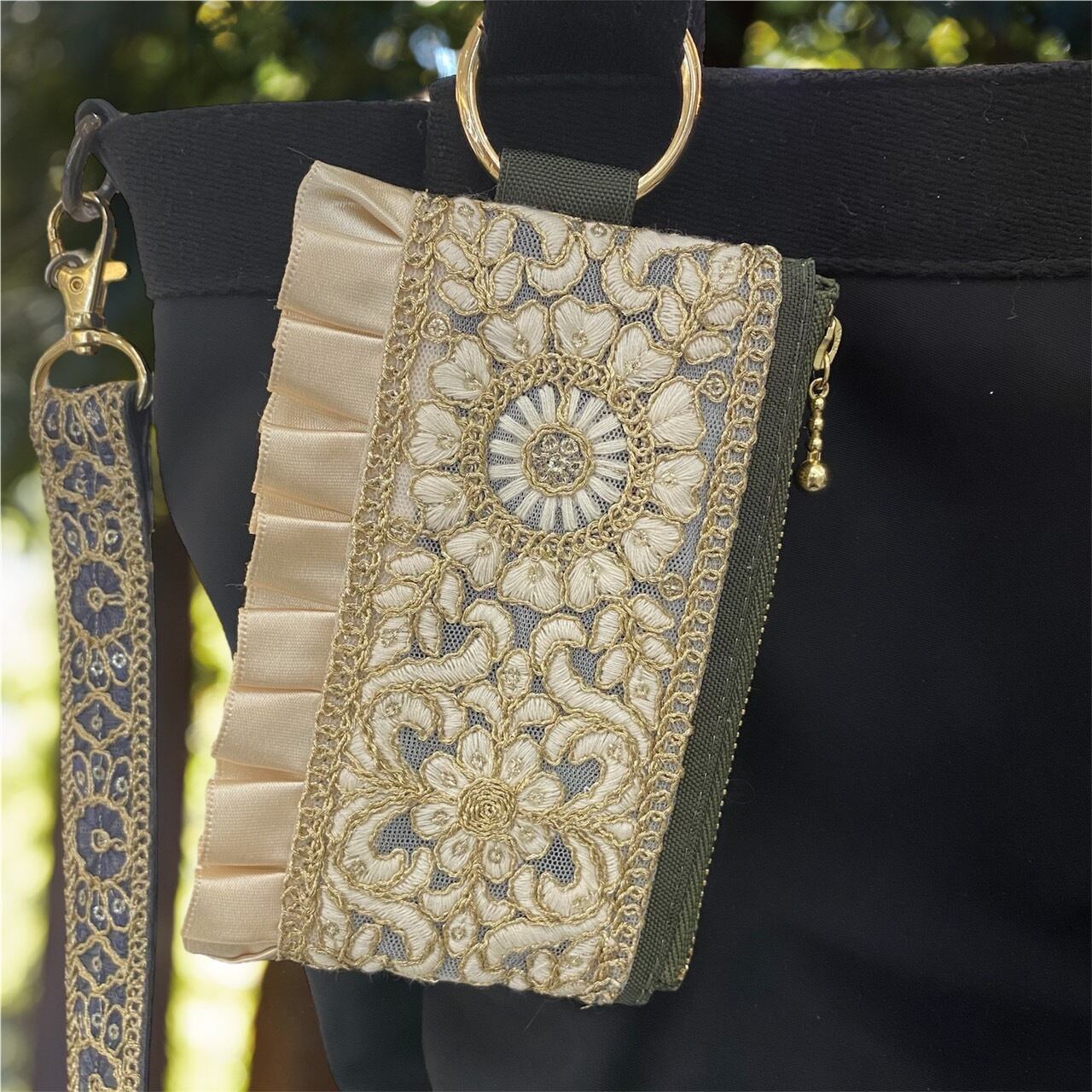 インド刺繍リボン フリル付き カラビナポーチ 【撥水生地】UBG-7 カーキ