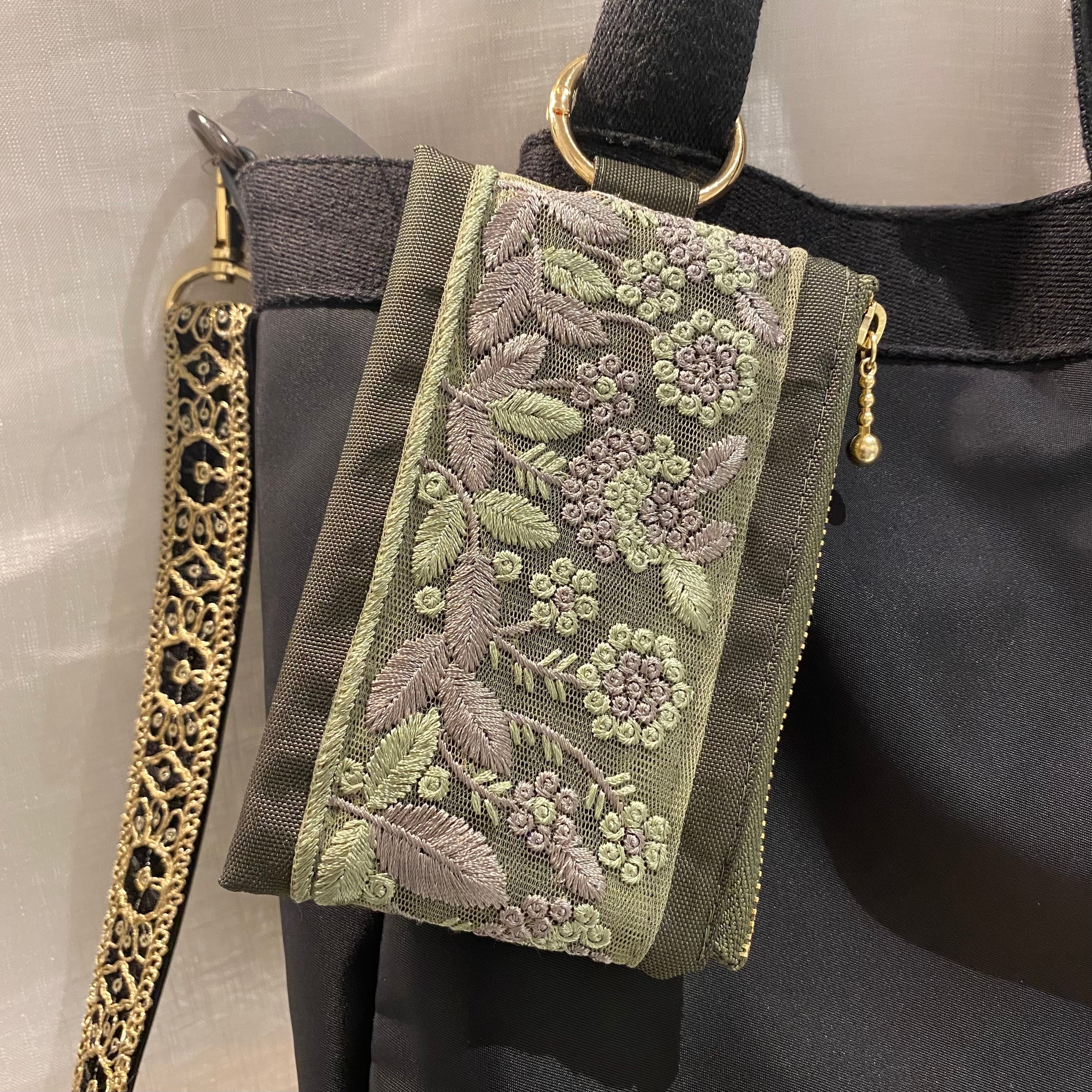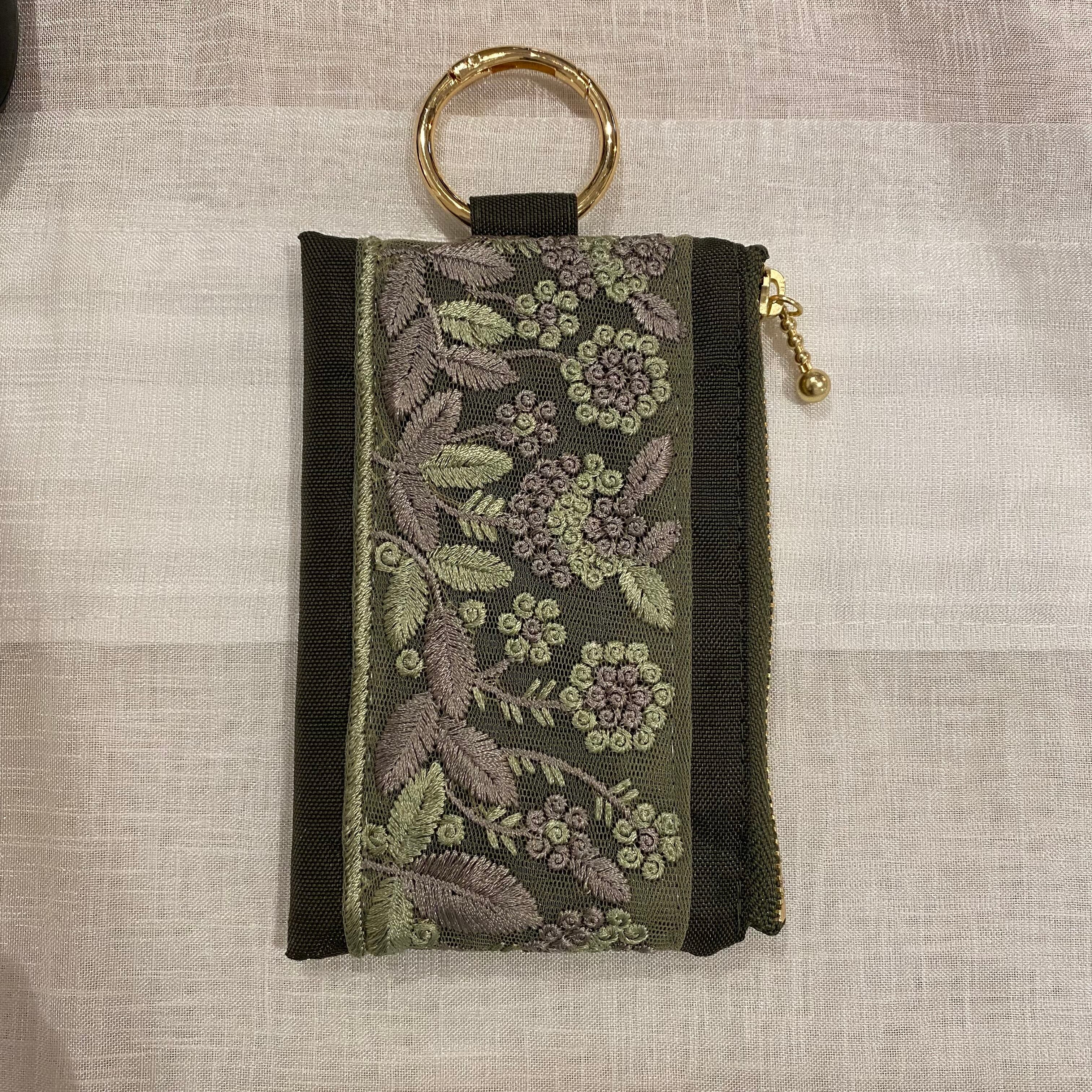 インド刺繍リボン カラビナポーチ 【撥水生地】UBG-12カーキ
